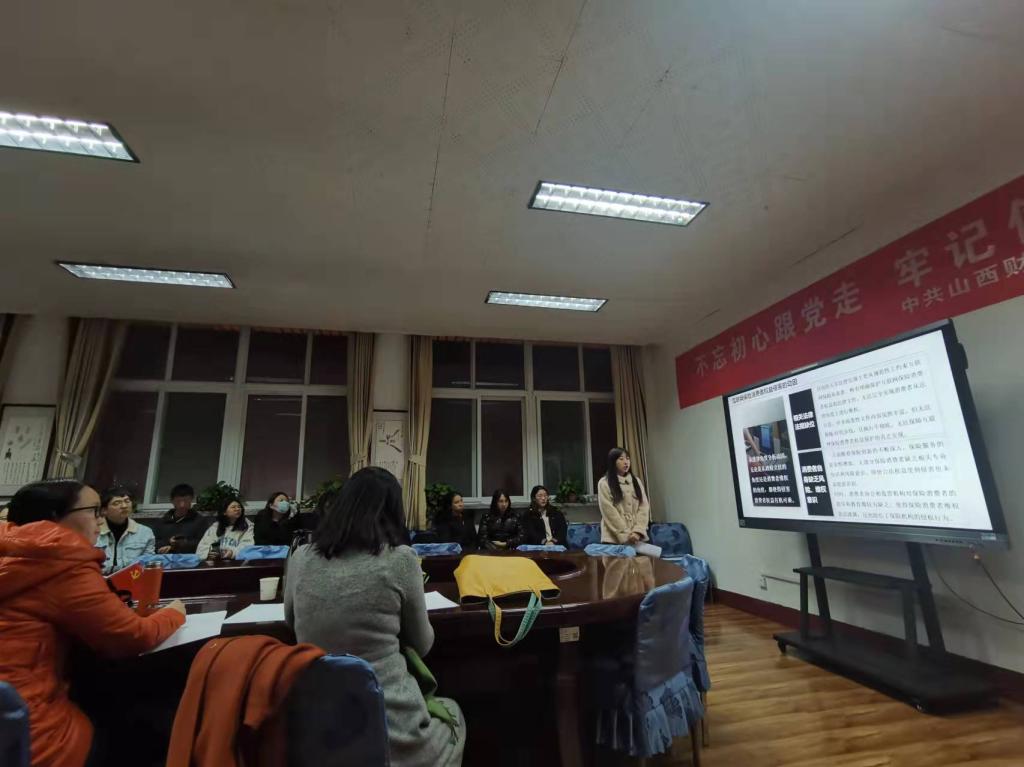 2021-2022学年第6期学术沙龙活动在高姝姝同学的主持下如期举行,本次沙龙的主题是"互联网保险中消费者权益的保护", 由2021级保险专硕班的洪紫含和杨洁为大家作汇报讲解,本次沙龙有幸邀请到王朝晖老师和高侯平老师作为讲评嘉宾,2021级各专业的同学参加了本次沙龙。
