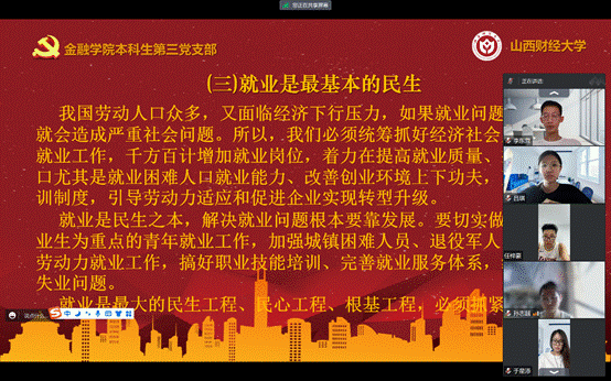 概要:继上次本科生第三党支部预备党员季雅婧带领大家学习第九章和第十章的内容后,在7月30日进行了第十一章的学习,本章的主要内容是“坚持在发展中保障和改善民生”,本章由本科生第三党支部预备党员孙志越带领大家学习,本科生第三党支部邱马玥主持并总结发言。