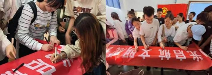“阳光启航,文明成长”主题活动,在横幅上认真签下自己的名字,勉励自己学礼知礼、修身明德,不断增强文明意识,加强自己作为青年团员的道德建设和行为塑造。红旗飘扬,青春正好,一笔一划里写下的都是同学们对青春的庄严承诺。
