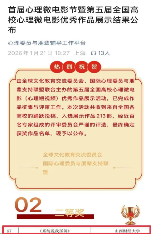 学子积极心理素养与综合创作能力的生动写照。未来,我们将继续深耕心理健康教育领域,持续讲好山财学子的心理成长故事,让更多优秀的心理文化作品成为滋养师生心灵的生动教材,不断为培育自尊自信、理性平和、积极向上的时代新人注入源源不断的“心”动能,推动学校、学院心理育人工作再上新台阶。