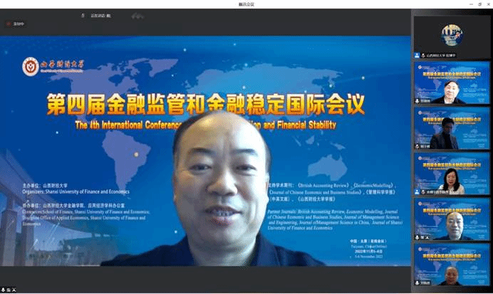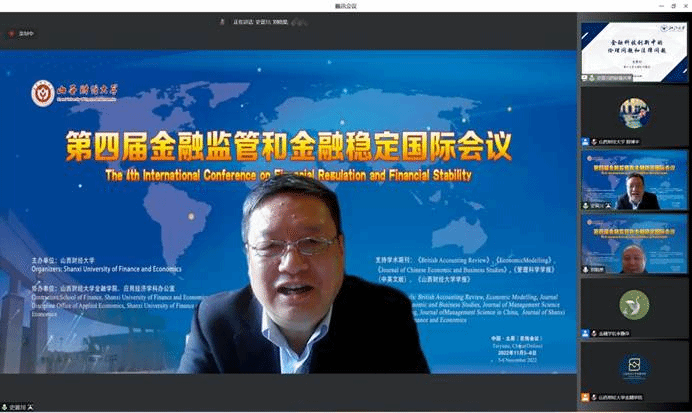 The 4th International Conference on Financial Regulation and Financial Stability was hosted by Shanxi University of Finance and Economics on November 5th and 6th, co-sponsored by the School of Finance and the Discipline Office of Applied Economic, and supported by British Accounting Review, Economic Modelling, Journal of Chinese Economic and Business Studies, Journal of Management Science and Engineering, Journal of Management Science in China, Journal of Shanxi University of Finance and Economics. 97 experts and scholars from more than 30 universities and colleges, including University of London, London Business School, University of Edinburgh, the FOM University of Applied Sciences, Zhejiang University, the University of Macau, Nanjing University, Xiamen University, Southeast University, Shandong University, Hunan University, Tianjin University, Sun Yat-sen University, Central University of Finance and Economics, Capital University of Economics and Business, Beijing Normal University and etc., gathered online and discussed the cutting-edge issues in the field of financial security and risk prevention around the theme of “Financial Regulation and Financial Stability”.