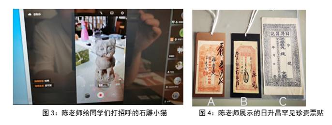 随后,陈老师一手拿着手机拍摄,一手操作镜头下的文物,并和同学们互动着讲解文物。比如,在呈现三张罕见的日升昌制钱票、银两票、铜元票的同时,陈老师不仅详述了它们的唯一性、稀缺性,还顺势让同学们回答哪一张是什么票,再解释如何辨析,认知的意义是什么;