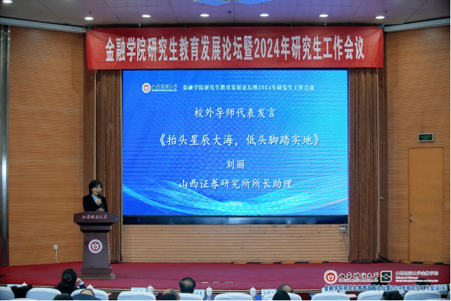 我是来自山西证券研究所的非银金融分析师刘丽,今天非常荣幸能够站在这里作为校外导师代表与大家面对面交流。十几年前,我同样青春洋溢、满怀信心,如同学们这般,沉浸在学术的海洋里,对未来满怀憧憬与期待。毕业之前,我职业的第一选择也是大学老师。在此,对财经大学番茄社区