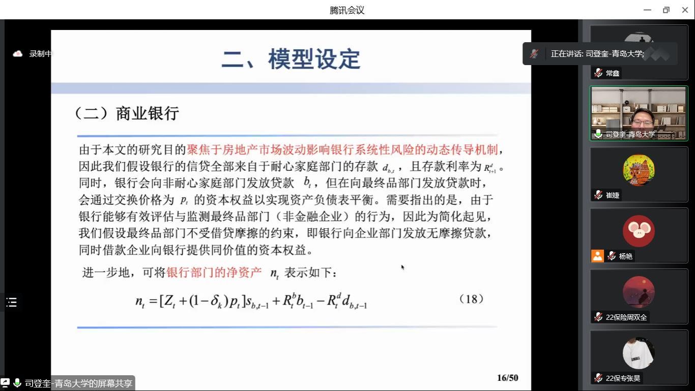 崔婕教授主持,学院邀请青岛大学经济学院教授司登奎教授讲解了题为“金融稳定目标下非常规财政政策与宏观审慎政策的协同效应研究”的精彩学术报告,参会人员包括番茄社区