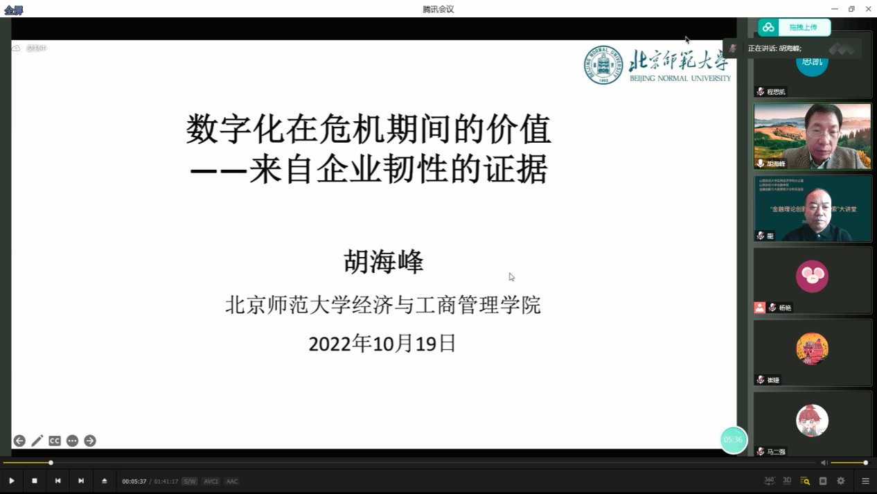副校长沈沛龙教授主持,邀请到了北京师范大学经济与工商管理学院金融系主任胡海峰教授讲解了一篇题为“数字化在危机期间的价值——来自企业韧性的证据”的精彩的学术报告,参会人员包括番茄社区