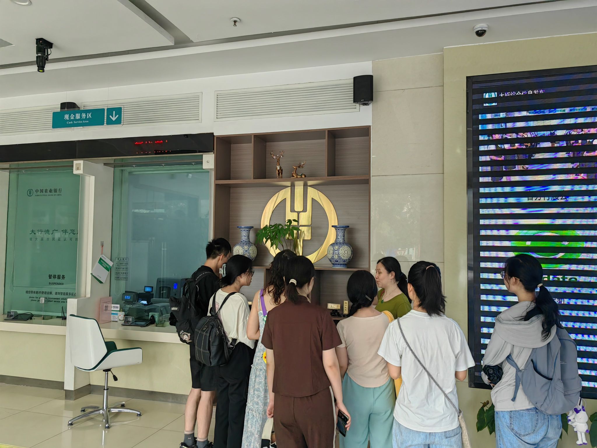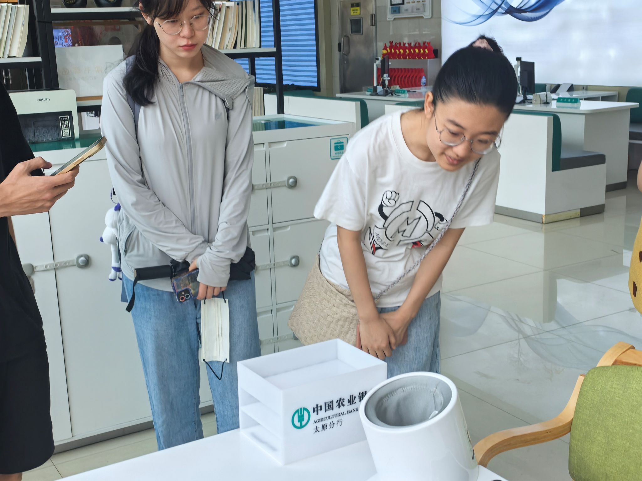 到达学府支行后,首先,在大堂经理的带领下,大家了解了银行网点的功能分区,包括办理现金存取款业务的高柜区、自助区,办理对公业务、理财业务的低柜区。在智能超级柜台上,学生们还亲自体验了开卡、开掌银业务。除了业务办理区,在客户等待区,网点还有很多暖心又人性化的配置,舒适的沙发、不同度数的老花镜、各种主题的书籍,甚至还有电子血压仪……与想像中的银行大有不同。同学们纷纷感叹,现代银行太有温度了。